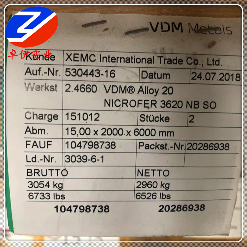 國際通稱:Alloy 20合金、UNS N08020、NS143、Inconel alloy20/NAS 335X、W.Nr.2.4460